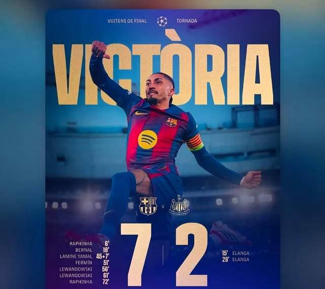 在刚刚结束的欧冠1/8决赛次回合中,巴塞罗那坐镇诺坎普球场,以7-2狂胜纽卡斯尔联队,总比分8-3成功淘汰对手,昂首挺进欧冠8强。比赛中,拉菲尼亚表现神勇,直接参与制造了五粒进球,莱万多夫斯基则梅开二度,亚马尔也贡献了宝贵进球。随着球队和球迷共同庆祝这场大胜,俱乐部方面也同时收获了丰厚的奖金收入。